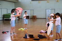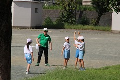 何やらバスタオルを持って振り回しています。何をしているのでしょうか。運動会の練習のようですよ。子どもたちはしきりに「アウフグース」とか「パラシュート」とかいっています。謎です。