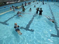 先日、5年生が着衣のまま、浮いて待て訓練をしました。救助の方が来るまでなるべく体力を使わず待つ訓練です。安全な夏を過ごすために、皆真剣に取り組みました。