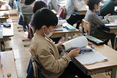 国語 「この詩の特ちょうを考えよう」 詩の特徴について考えた後、まず最初に全員で読んでみました。その後、何人かが代表で読みました。発表者がどの部分を意識して読んだか教えてもらったり、自分で気がついたことをまとめたりしながら、より深く詩の特徴を捉えました。