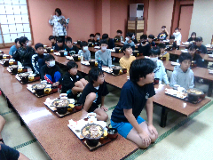 食べる前におかわりの説明を聞いています。みんなおかわりをする気満々のようです。