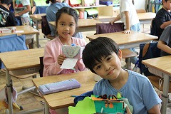 素敵な作品を作って、今日はその鑑賞会をしました。担任の先生の「すてきなところ、いいなと思うところをたくさんみつけて、おともだちにいってあげようね」の声かけに、子どもたちは、お互いの作品のよいところ、すてきなところをたくさん伝え合っていました。鑑賞会は「ほめあい会」という素敵な会になりました。担任の先生も「みんなほめ上手だね~」とニコニコしていました。